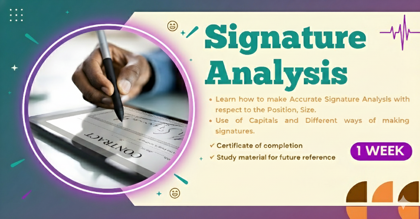 The course will cover how to conduct accurate signature analysis by considering factors such as position, size, use of capitals, and different ways of making signatures